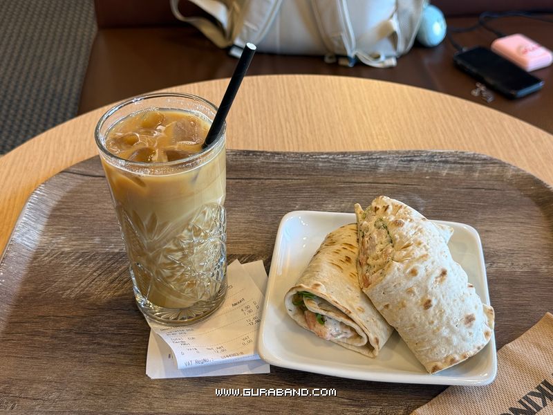 배는 채워야해서 라떼 한 잔과 연어랩을 하나 사서 둘이 나눠먹었다. ㅠㅠ (12.8유로)