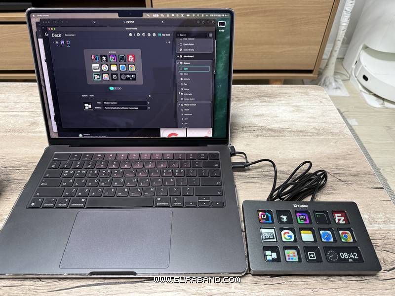 맥북에 연결해서 각각의 키에 원하는 기능을 연결 중인 모습.