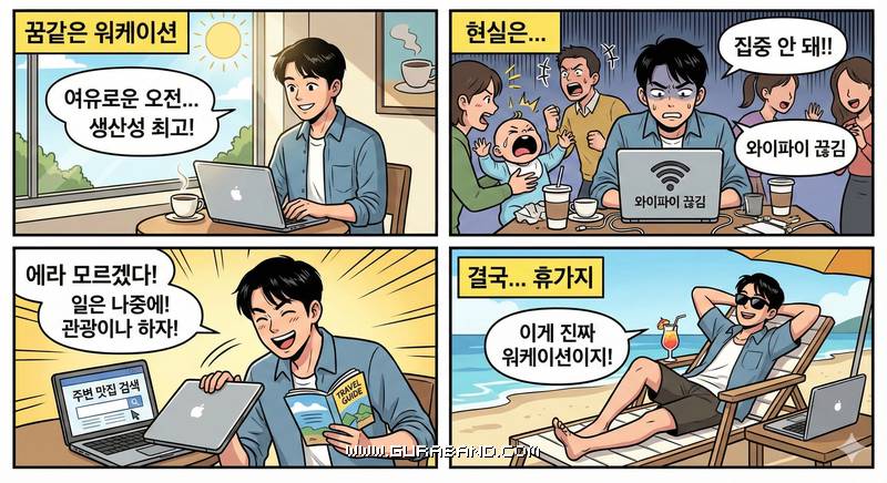 잼민이(gemini)에게 워케이션으로 4컷 만화를 그려달라고 했다.